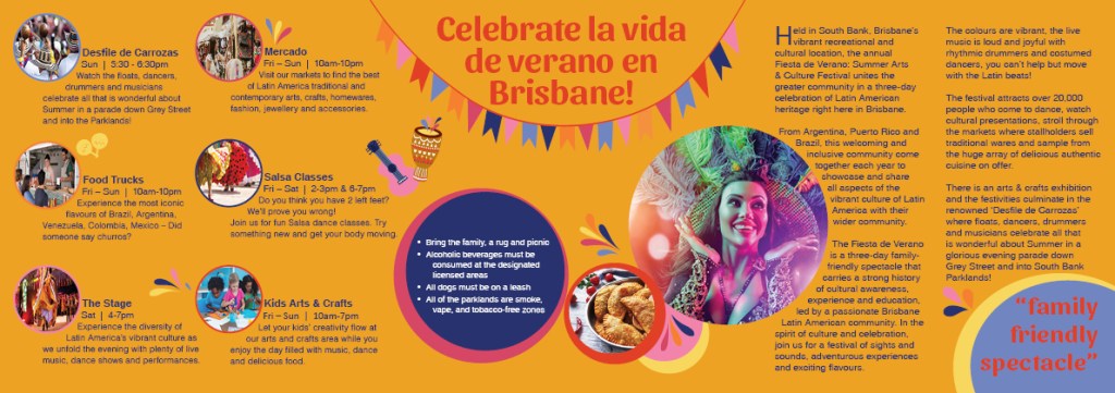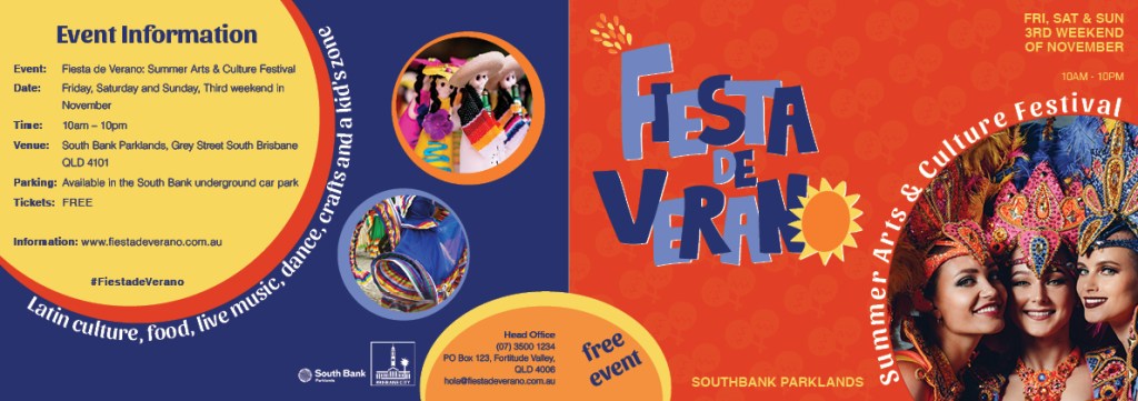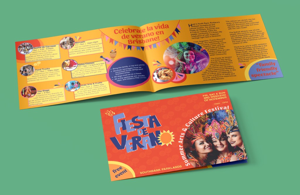 This bifold A5 brochure is for an annual Latin festival, containing all the information visitors would require to have an enjoyable day. The brief included designing a hand drawn festival name on the cover and using supplied images and graphics in a fun and inviting way.